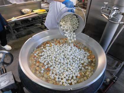 今日の「関東煮」には、うずら卵が入っています。卵アレルギーの児童には、うずら卵を入れる前に取って、個別のお椀に入れて渡します。