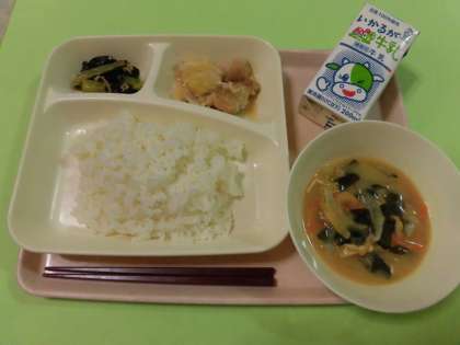 ・ごはん ・牛乳 ・鶏肉のおろしじょうゆかけ ・みそ汁 ・こまつなのいためもの です。