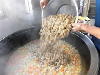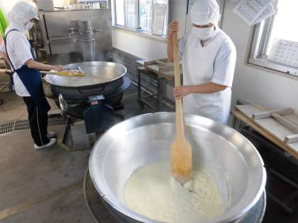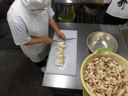 エリンギ、マッシュルーム、しめじを使っています。シチューのルウは、給食室で手作りしています。