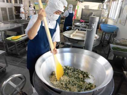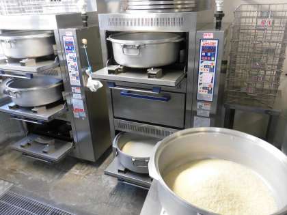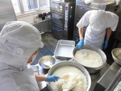北巽小学校では、ごはんも給食室で炊いています。米は、北海道産のおぼろづきという品種を使っています。