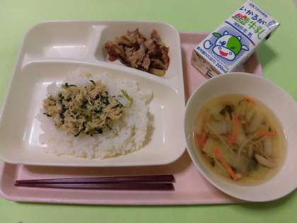 ・ごはん ・牛乳 ・豚肉のスタミナ焼き ・すまし汁 ・とりなっ葉いため です。