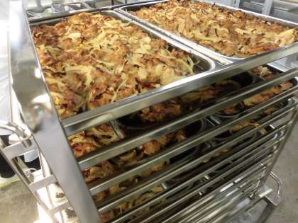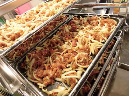 「豚肉のスタミナ焼き」は、にんにく、料理酒、砂糖、こいくちしょうゆ、白みそで下味をつけた豚肉とたまねぎを焼き物機で焼いています。