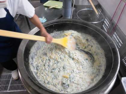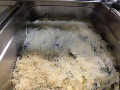 具を釜で炒めてからミニバットに入れて、粉末チーズとパン粉をふって、焼き物機で焼いています。こんがりと焦げ目がついて、とてもおいしそうですね。