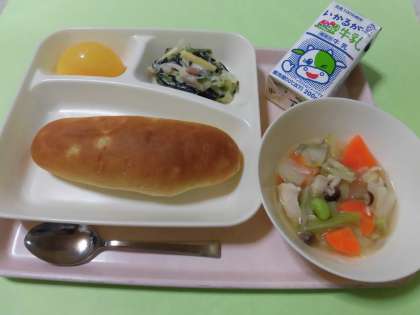 ・おさつパン ・牛乳 ・ほうれんそうのグラタン ・スープ煮 ・白桃(缶) です。