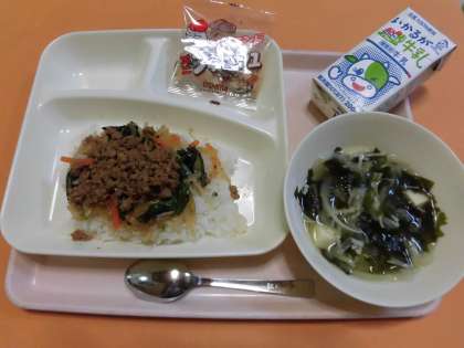 ・牛乳 ・ビビンバ ・わかめスープ ・アーモンドフィッシュ  です。