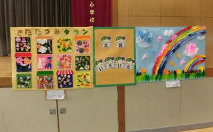 いきいき活動の子どもたちの作品「きたたつみタウン」「虹のかけはし」です。