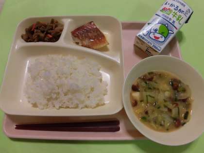 ・ごはん ・牛乳 ・あかうおのしょうゆだれかけ ・なめこのみそ汁 ・きんぴらごぼう です。