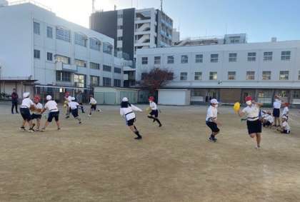 体育科の授業では、「タグラグビー」を学習しました。準備運動や基本動作をしました。その後、1対1や4チームのチーム戦を行いました。