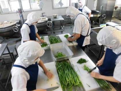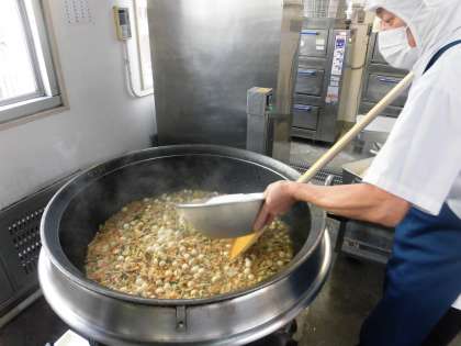 今日は、「中華丼」にうずら卵が入っています。うずら卵にアレルギーのある人には、うずら卵を入れる前に取ったものを給食室で渡します。