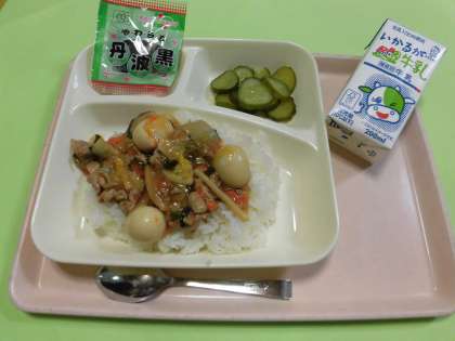 ・牛乳 ・中華丼(うずら卵除去対応) ・きゅうりのピリ辛あえ ・ソフト黒豆 です。