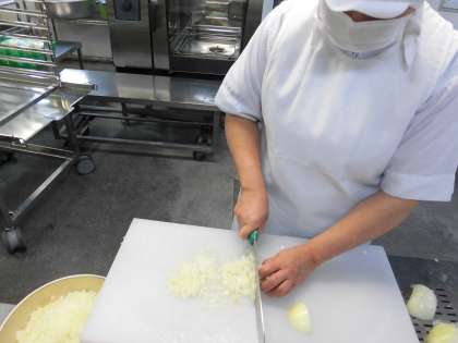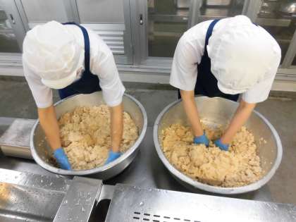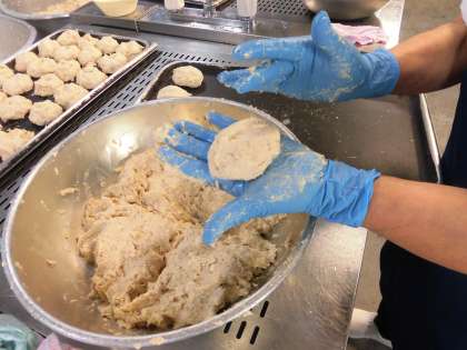 ツナ、とうふ、たまねぎを使って、生地を作り、一人一個ずつに丸めています。卵は使っていません。ふわふわの食感で、とてもおいしいですね。ケチャップをかけて食べましょう。