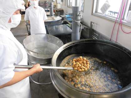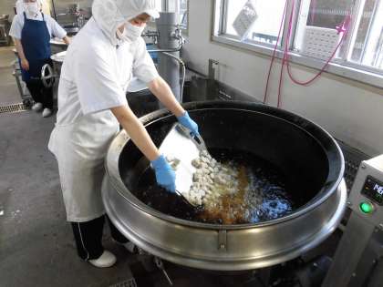 1人2個ずつのシューマイを、油で揚げています。くっついてしまわないように、焦げないように、やさしく見守りながら揚げてくださいました。