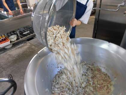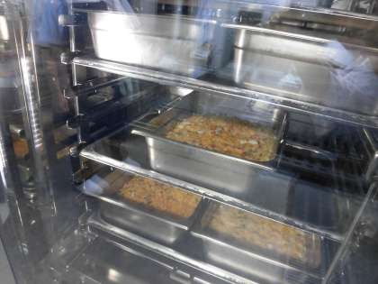 釜で米と具材を炒めてから、ミニバットに入れて、焼き物機で焼いています。パン粉と粉末チーズでつけた焼き目が、とてもおいしそうですね。