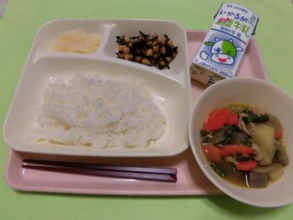 ・ごはん ・牛乳 ・鶏肉と野菜の煮もの ・ひじき豆 ・かぶのゆず風味 です。