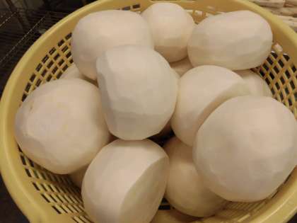 かぶは、冬が旬の野菜です。真っ白で大根に似ていますが、食感がとても柔らかいです。今日は、ゆずの香りがとても良いさっぱりした味つけにしています。