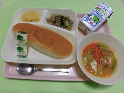 ・コッペパン ・牛乳 ・豚肉と野菜のソテー ・スープ ・スイートポテト ・ソフトマーガリン です。