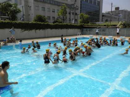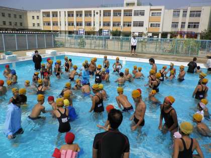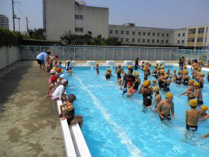 本校のプールで、5年生と白菊幼稚園年長園児とで幼小合同プールを行いました。これは、幼稚園児が入学後、スムーズに学校生活が始められるようにするための幼小連携教育のひとつとして実施しました。児童も園児も楽しく活動することができました。特に5年生は、いつもより優しい表情でいる姿が印象的でした。