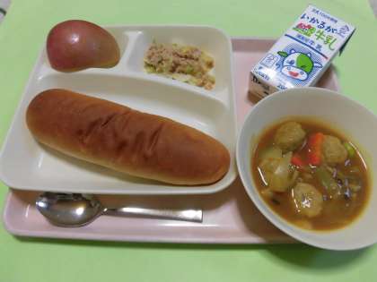 ・ミートボールと野菜のカレー煮 ・ツナとキャベツのソテー ・りんご ・黒糖パン ・牛乳  です。