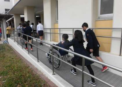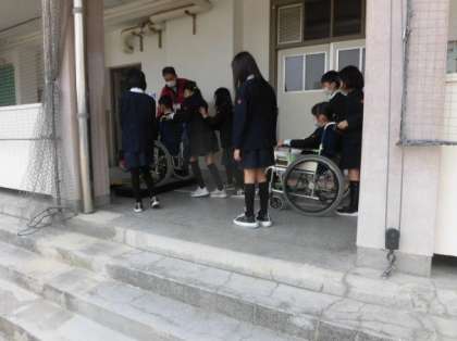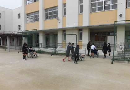 介助の仕方の注意点についての説明後、子どもたち全員が車いすの介助体験をしました。運動場、スロープ、廊下、段差等の長いコースを、グループで協力して、友だちを乗せた車いすを安全に進めることができました。