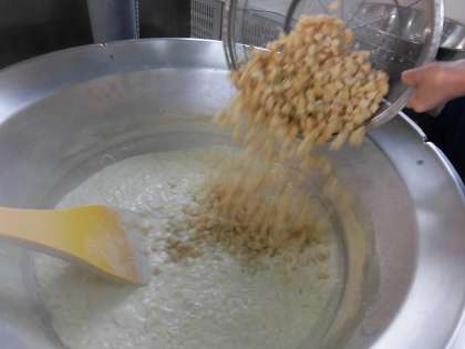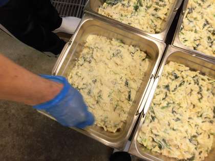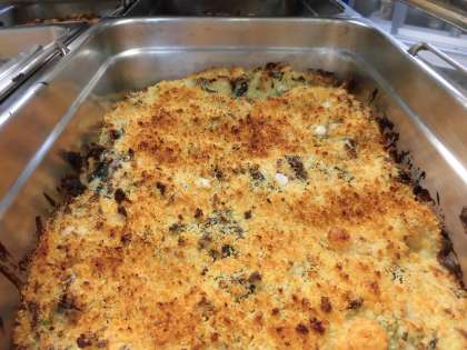 釜で炒めた具を、ミニバットに入れて、焼き物機で焼いています。粉チーズとパン粉をふっているので、こんがりと焼き目がついて、とてもおいしそうですね。