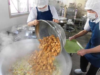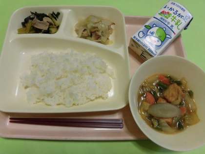 ・鶏肉のゆず塩焼き ・あつあげと野菜の煮もの ・こまつなの煮びたし ・ごはん ・牛乳 です。
