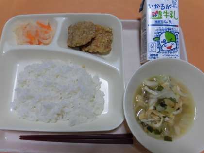 ・さばのカレーたつたあげ ・五目汁 ・紅白なます ・ごはん ・牛乳 です。