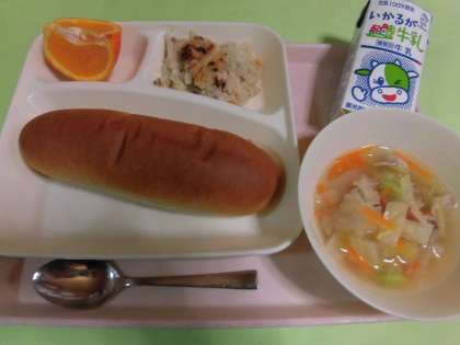 ・押麦のグラタン ・豚肉と野菜のスープ ・いよかん ・黒糖パン ・牛乳 です。
