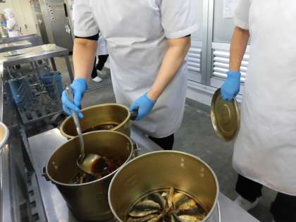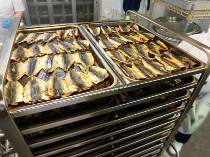 給食では、焼き物機で焼いてしょうがの香りがきいたしょうゆだれをかけたいわしと、いり大豆がつきます。