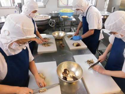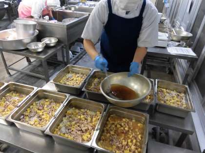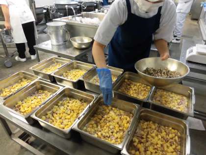給食では、焼き豚、もち米、くり、しいたけ、調味料をミニバットに入れて、焼き物機で蒸し焼きにします。旨みのあるだしの味ともちもちの食感がとてもおいしいです。