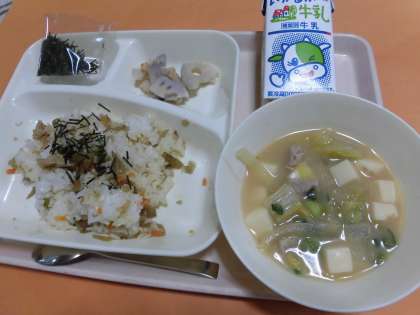 ・鶏ごぼうご飯 ・とうふのみそ汁 ・焼きれんこん ・牛乳 です。