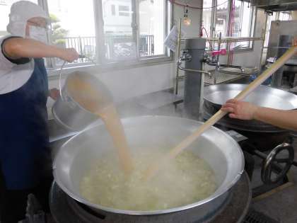 「鶏ごぼうご飯」は、鶏ひき肉、つきこんにゃく、ごぼう、にんじん。グリンピースで作った具を、ご飯に混ぜ、きざみのりをふって食べます。