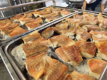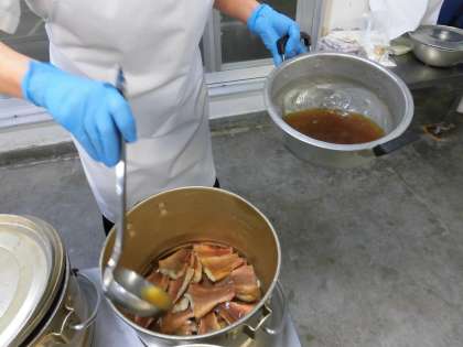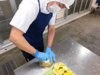 今日は、広島県産のレモンを使っています。給食室でレモンをしぼり、料理酒、みりん、うすくちしょうゆで作ったたれをかけています。