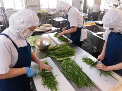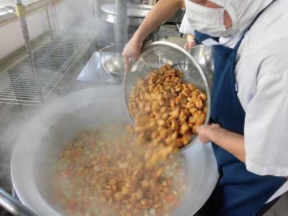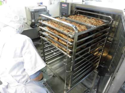 今日の豚肉は、しょうが、にんにく、オイスターソース、こいくちしょうゆ、綿実油で下味をつけて、焼き物機で焼いています。