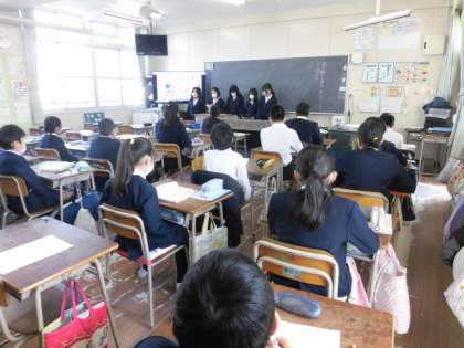 各グループで、資料から分かったこと、さらに調べたことをうまくまとめ、協力して発表していました。他の人は、発表を聞いて、それぞれのグループの良かったところ、自分たちががんばったところをワークシートに書き込んでいました。