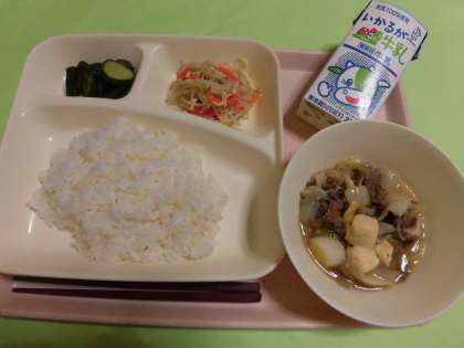 ・すき焼き煮 ・もやしとささみのいためもの ・きゅうりのゆず風味 ・ごはん ・牛乳 です。