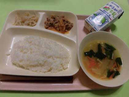 ・豚肉のコチジャンいため ・鶏肉とはるさめのスープ ・もやしのナムル ・ごはん ・牛乳 です。
