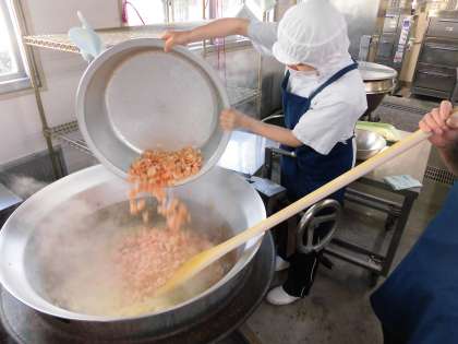 「えびのチリソースいため」は、トウバンジャンを使って、少しピリ辛の味つけです。