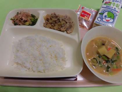 ・豚肉のしょうが焼き ・さつまいものみそ汁 ・なのはなのおひたし ・ごはん ・牛乳 です。