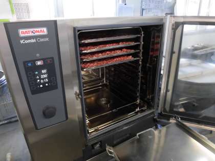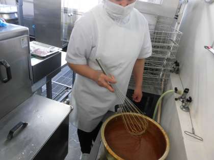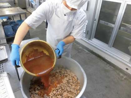 豚肉を焼き物機で焼いて、りんごピューレ、デミグラスソース、ウスターソース、ケチャップで作ったソースをかけています。