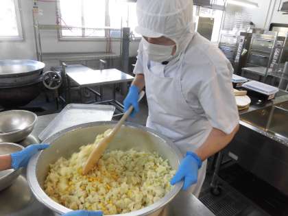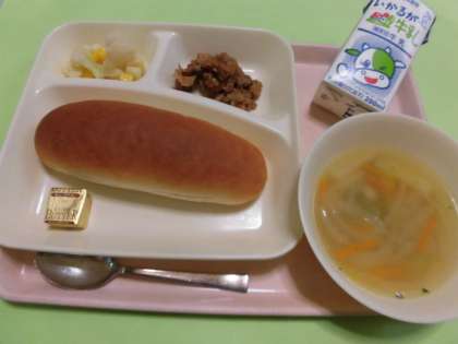 ・豚肉のデミグラスソース ・スープ ・カリフラワーとコーンのサラダ ・コッペパン ・バター ・牛乳 です。