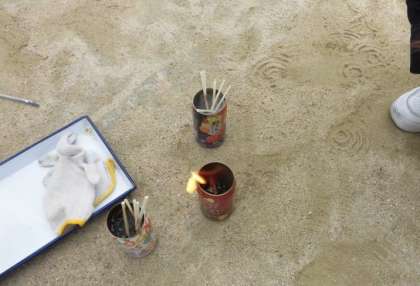 下に穴を開けたもの、上に穴を開けたもの、全く穴を開けないものと3つの空き缶を用意しました。それぞれに割りばしを入れて燃え方を調べました。