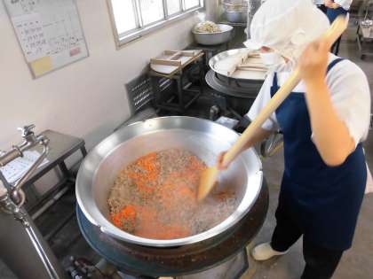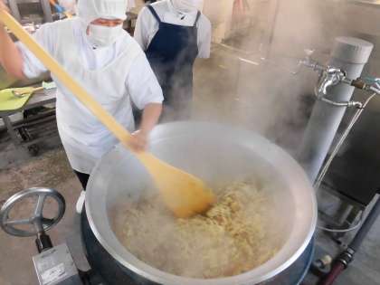 豚肉と野菜をいためた後、さっとゆでた中華めんを入れていためます。中華めんを入れると、とても重くなるので、調理員さんは力いっぱい焦げないように混ぜています。