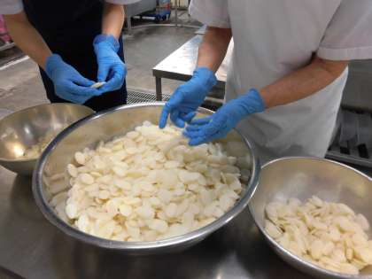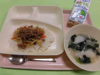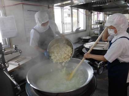 「トック」のもちは、そのまま入れるとくっつきやすいので、調理員さんがばらばらにはがしてくださっています。底からしっかり混ぜて、配ってくださいね。