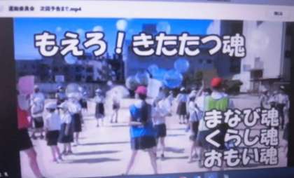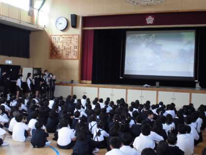 児童朝会で、6年生の代表の人たちが、1年生に「もえろ!きたたつ魂!」について、映像を使って、説明してくれました。