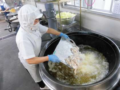 鶏肉に、しょうが汁、にんにく、塩、こしょうで下味をつけて、でんぷんをまぶして油で揚げています。