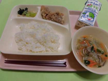 ・鶏肉のからあげ ・中華スープ ・チンゲンサイともやしの甘酢あえ ・ごはん ・牛乳 です。