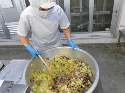 「キャベツの赤じそあえ」は、焼き物機で蒸したキャベツに、赤じそ、砂糖、米酢、うすくちしょうゆで味つけしています。