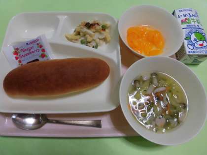 ・マカロニグラタン ・キャベツのスープ ・みかん(缶) ・コッペパン ・いちごジャム ・牛乳 です。
