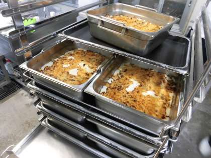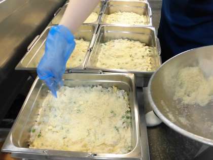 「マカロニグラタン」は、釜で炒めた具をミニバットに入れて、焼き物機で焼いています。表面に振った粉末チーズとパン粉の焦げ目がとてもおいしそうですね。