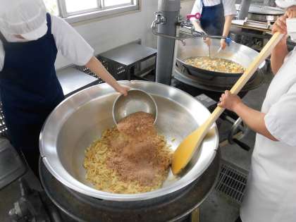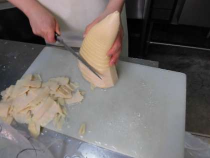 たけのこは、4月から5月にかけてが旬です。竹の若い茎の部分を食べます。今日は、ごまとかつおぶしを一緒にいためて、ごはんに添えて食べます。ごはんがとても進みますよ。